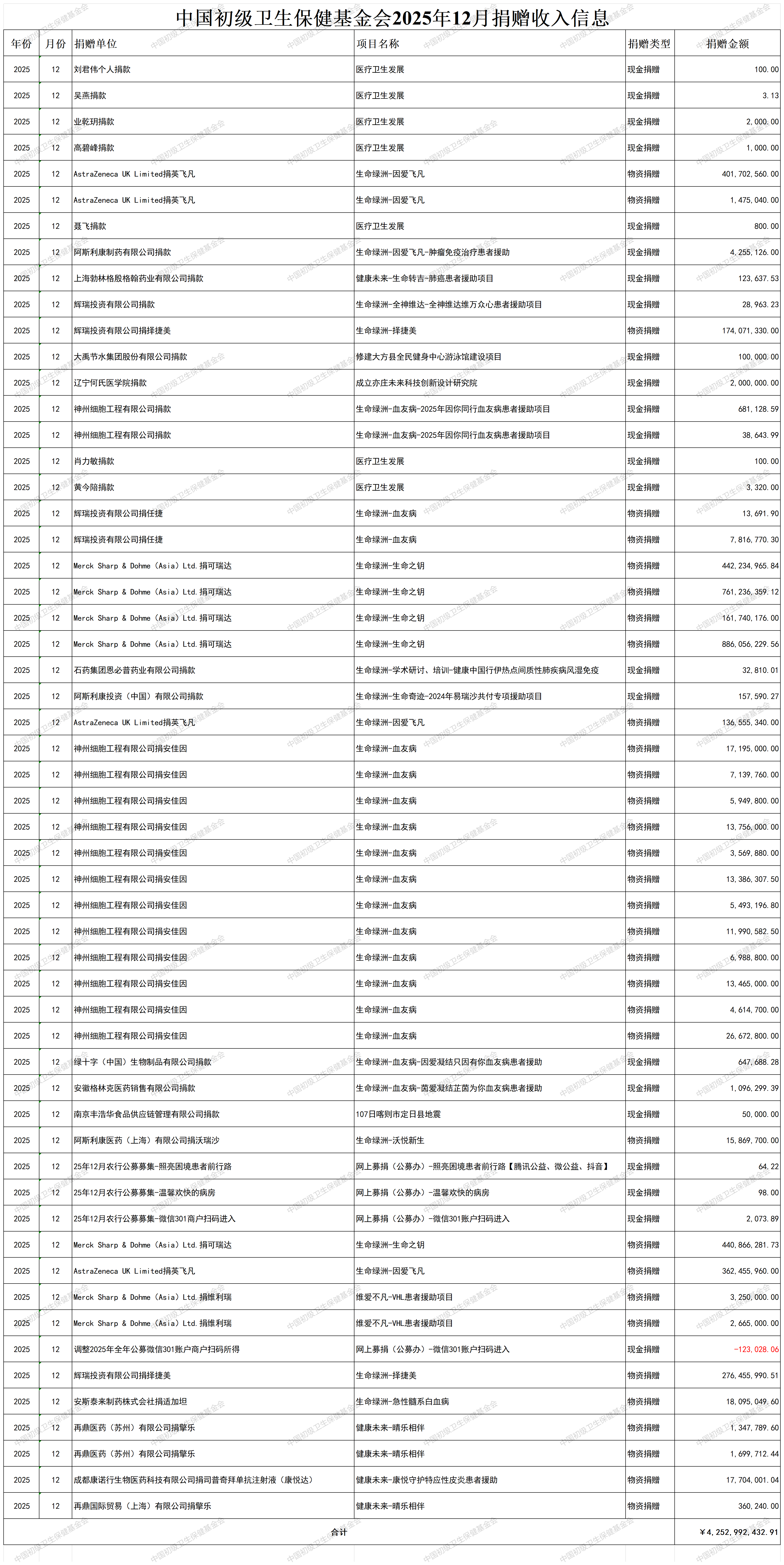 2025年12月份捐赠收入公示表