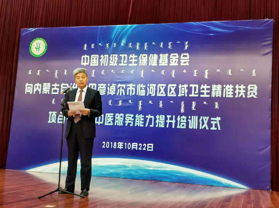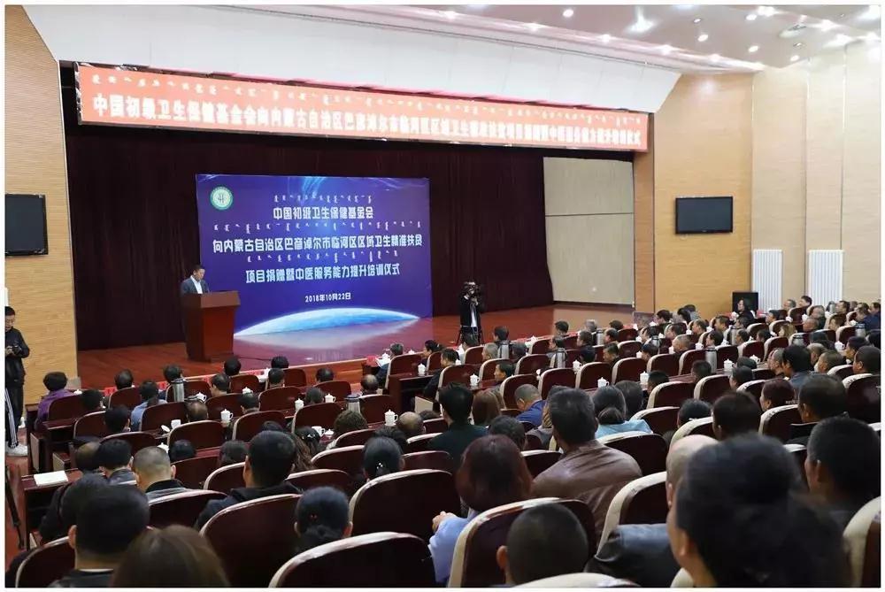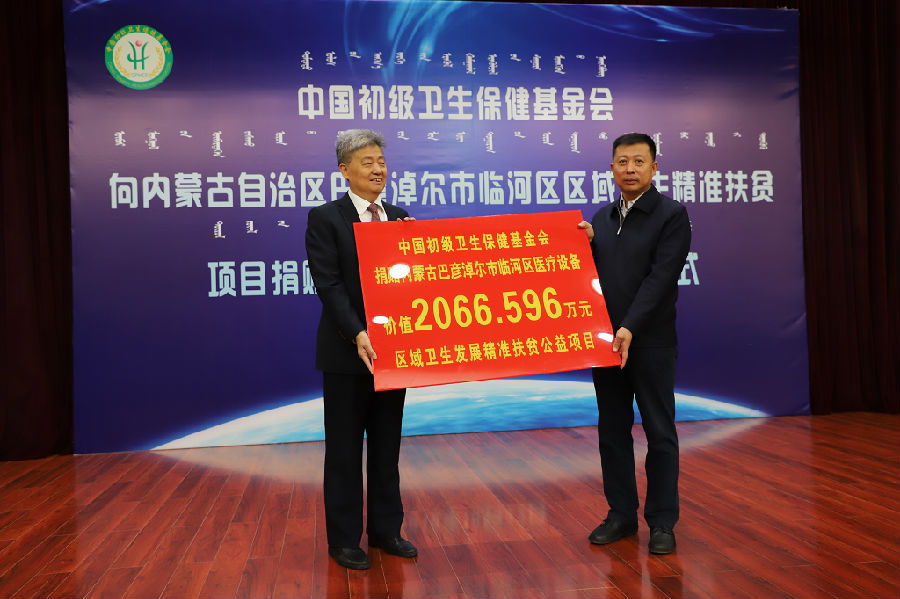 2018年10月22日上午,中国初级卫生保健基金会向内蒙古自治区巴彦淖尔市临河区“区域卫生发展精准扶贫”项目捐赠暨中医服务能力提升培训仪式在临河区党政大楼会议中心报告厅举行,共计向临河区政府捐赠价值2066.596万元的医疗设备,以帮助临河区基层医疗卫生健康事业的发展。