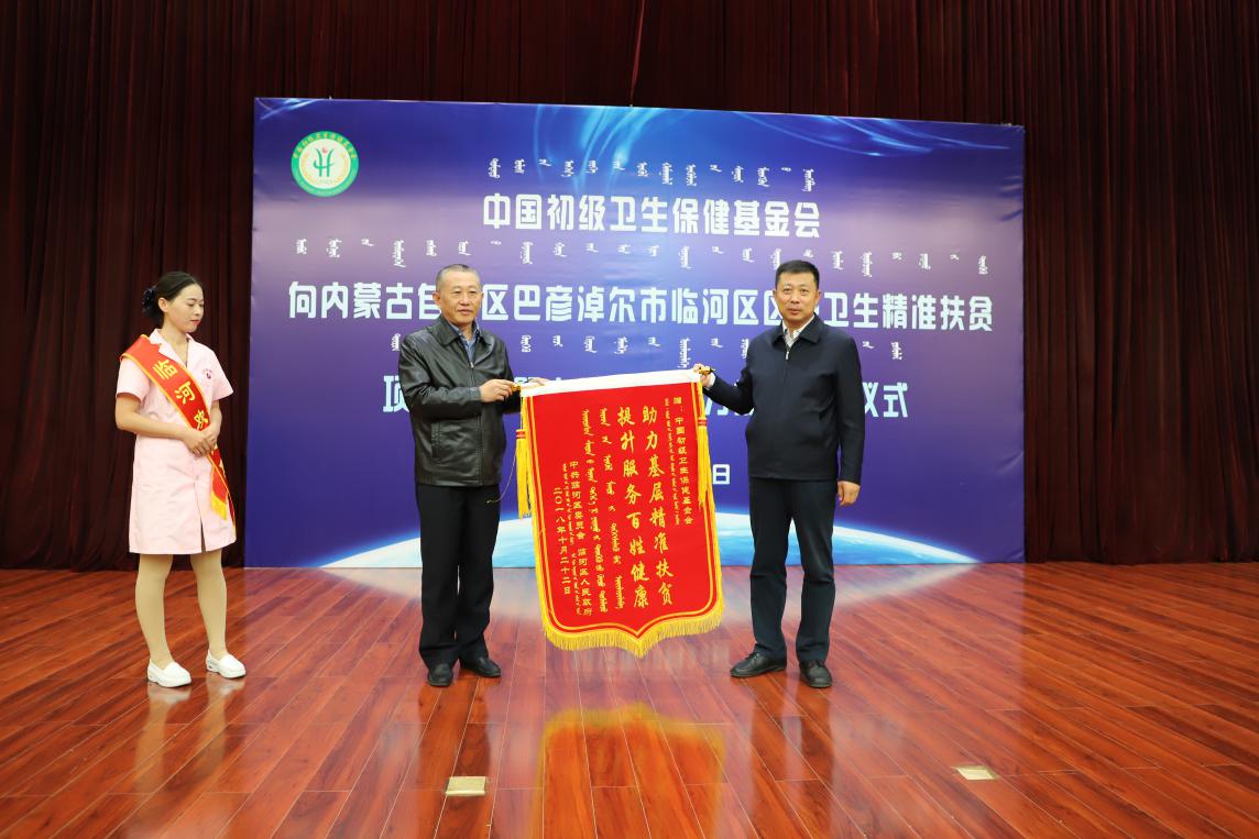 仪式上,中国初级卫生保健基金会理事长曹锡荣代表基金会向巴彦淖尔市委常委、临河区委书记王肇晟交付了项目所捐赠的医疗设备,王肇晟书记代表临河区委区政府向中国初级卫生保健基金会理事李宝金回赠锦旗表示感谢。
