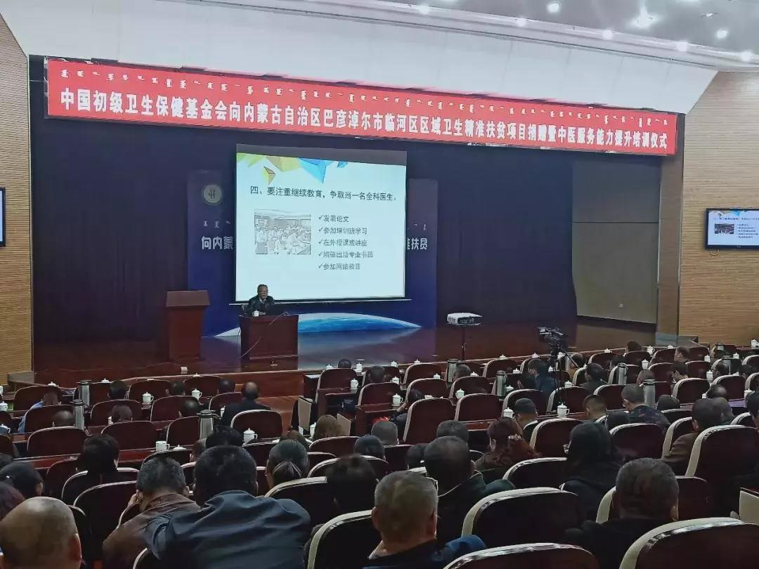医疗设备捐赠同时,中国初级卫生保健基金会还邀请了农工党内蒙古自治区委医药卫生工作委员会副主任、内蒙古自治区第三医院心身健康体检保健中心李建华主任,为临河区中医服务能力提升培训班开班作《如何成为当代的一名称职乡村医生》的专题讲座。临河区卫计局、乡镇卫生院、社区卫生服务中心、村卫生室等单位共230人参加此次培训。