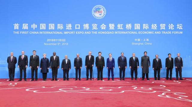 2018年11月5日,首届中国国际进口博览会在上海开幕。这是开幕式前,习近平同外方领导人集体合影。 来源:新华社