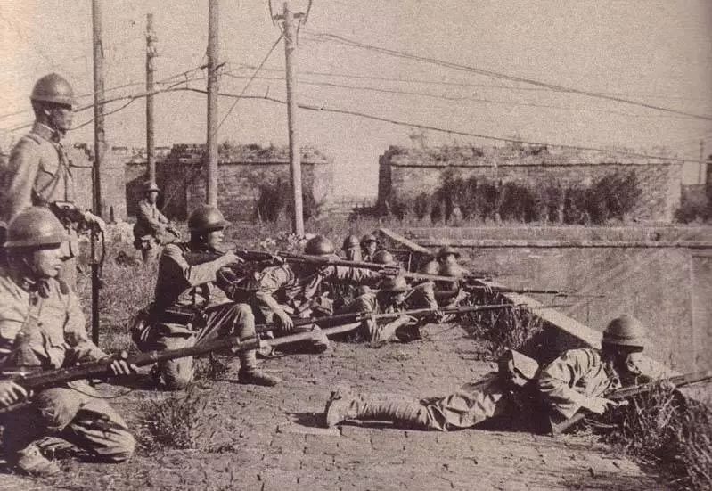 图为日军侵占沈阳城后,耀武扬威地站在城头,悬挂起日本国旗。