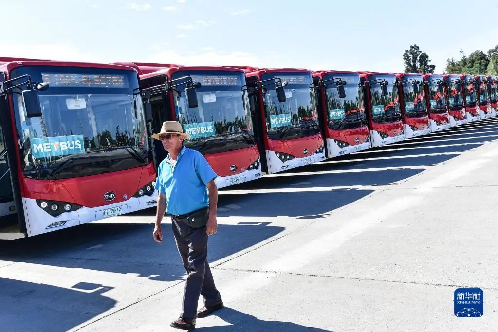 2018年12月13日,在智利首都圣地亚哥的奥伊金斯公园,一名男子从比亚迪电动大巴旁走过。新华社发(豪尔赫·比列加斯 摄)