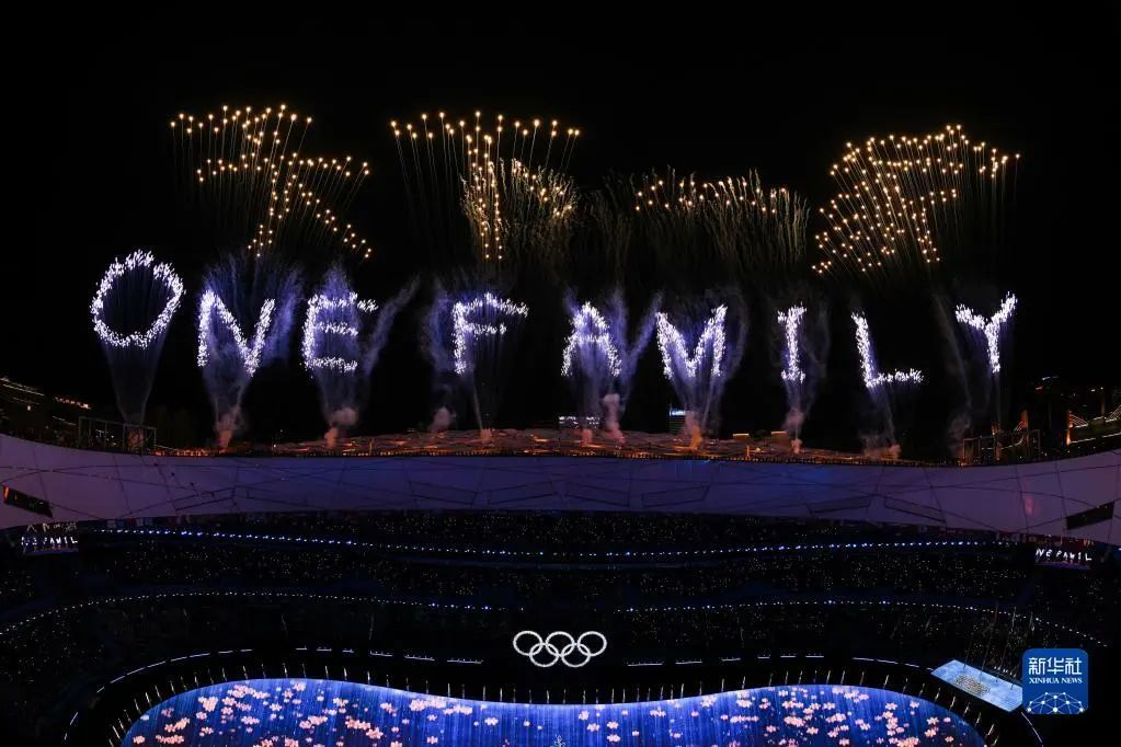 2022年2月20日晚,北京第二十四届冬季奥林匹克运动会闭幕式在国家体育场举行。这是焰火在“鸟巢”上空显示出中文“天下一家”和英文“ONE FAMILY”字样。新华社记者 宋彦桦 摄
